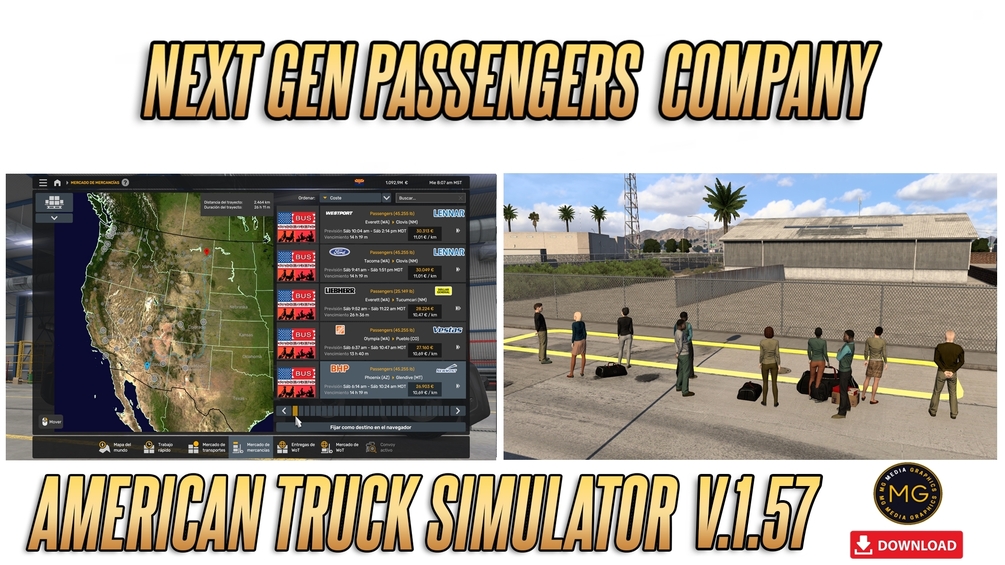 Convierte American Truck Simulator en una completa experiencia de transporte de pasajeros con el mod Next Gen Passengers Company – All Map Edition. Este proyecto te permite operar autobuses de forma realista en todos los mapas disponibles del juego, con soporte total para rutas de pasajeros, terminales personalizadas y compatibilidad con buses de marcas como Scania, Mercedes-Benz y Volvo.